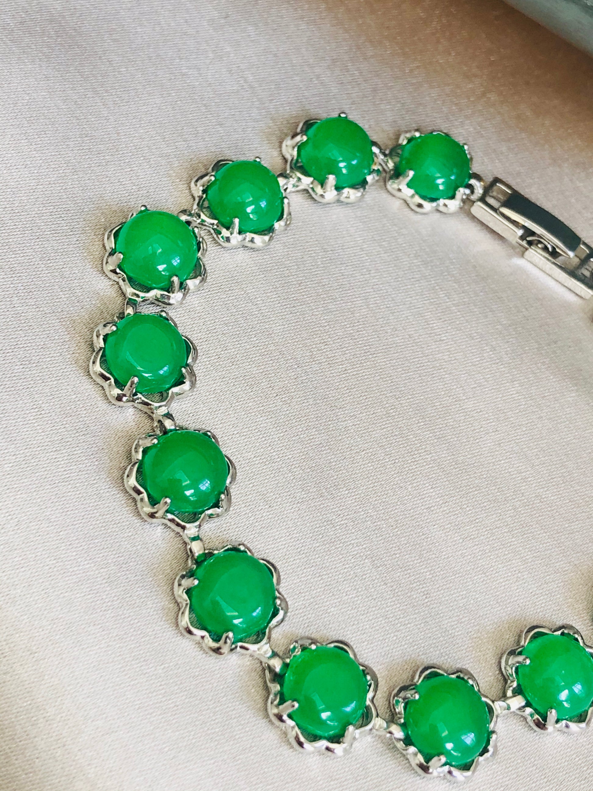 These parakeet green stones stand out on silver framing.