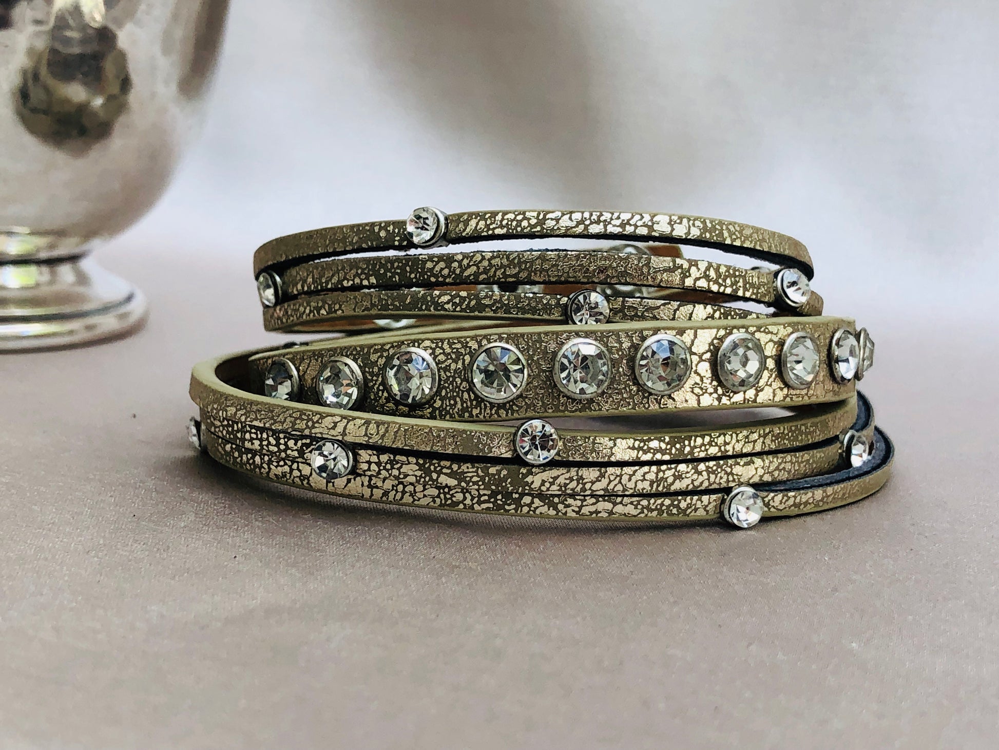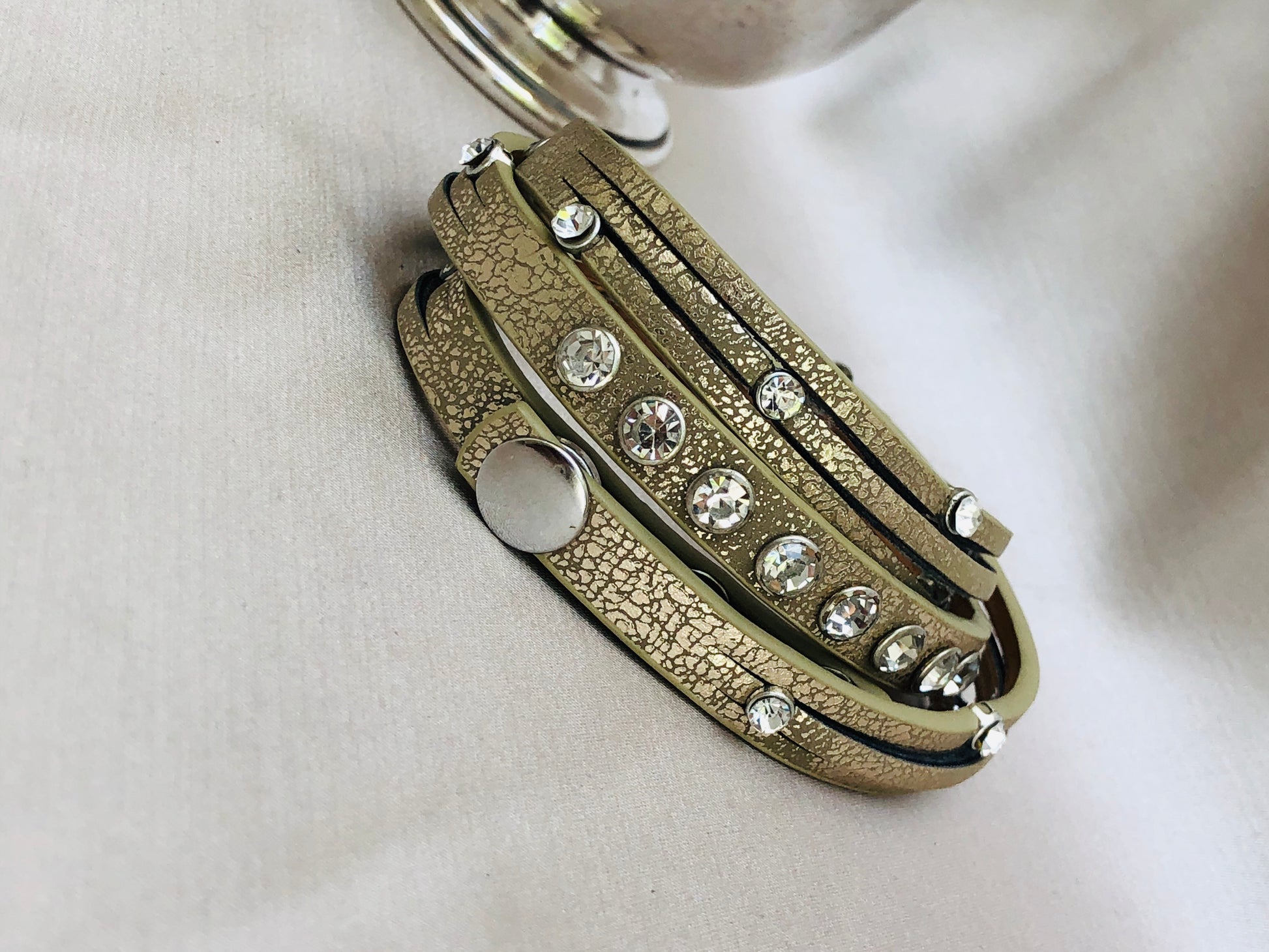 Gold leather winds around the wrist, on this diamond studded bracelet. Bracelet snaps shut. Tightness can be adjusted to three levels.