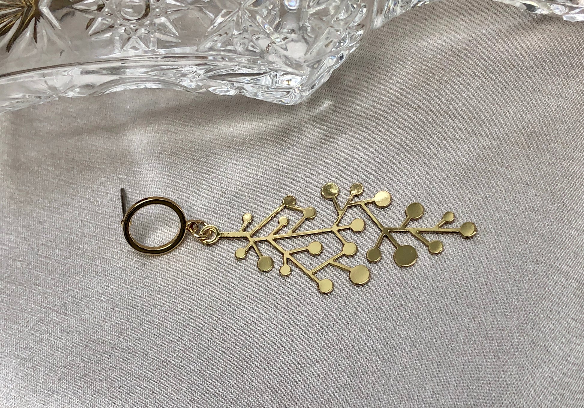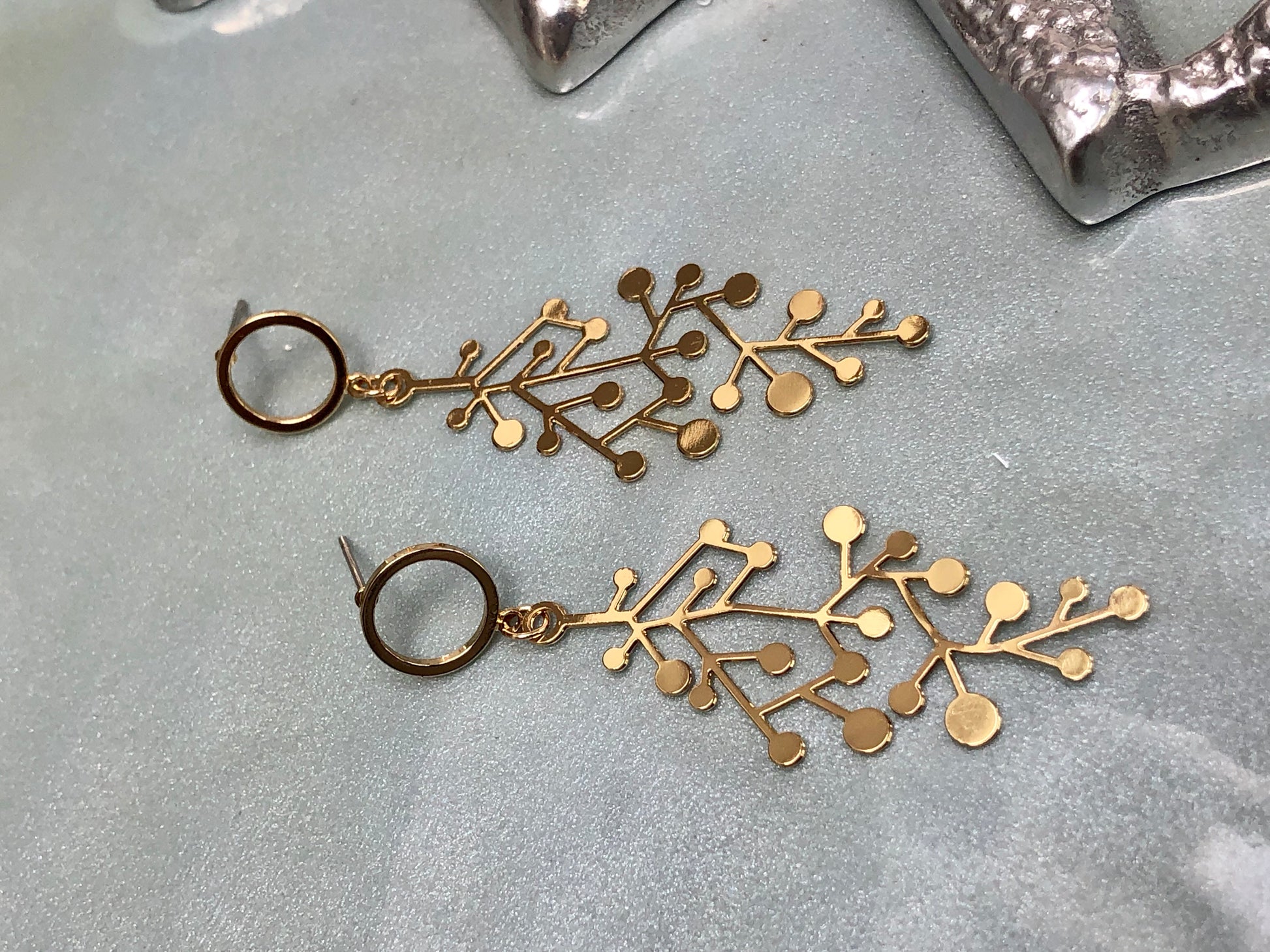 These gold earrings fun and wild! While they are large they are made of a light thin metal. They are made from entirely gold metal but as some of the pictures illustrate they catch the light and reflect other colors in fun ways.