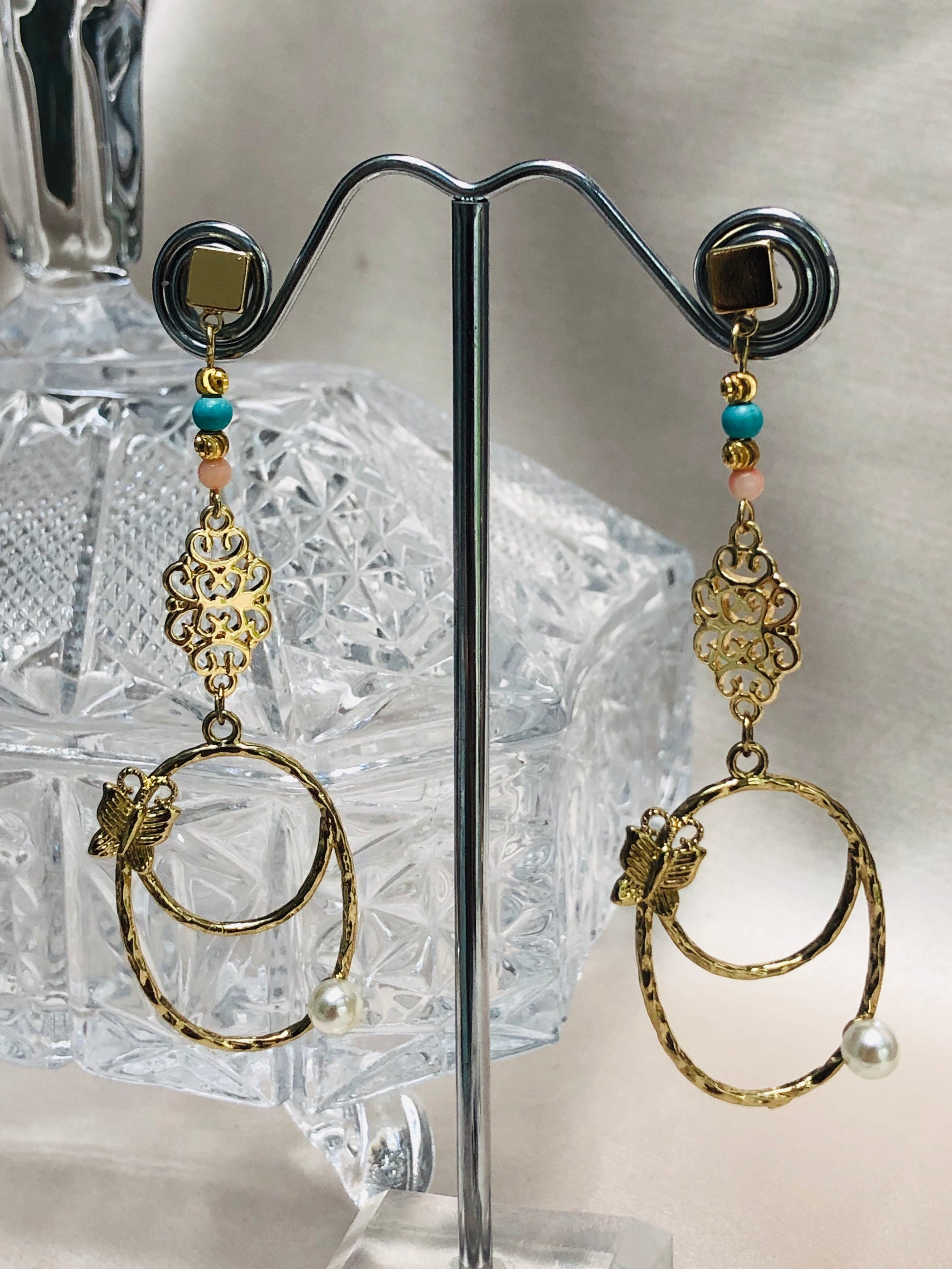These long detailed earrings feature a sweet little butterfly and small pearl accent.