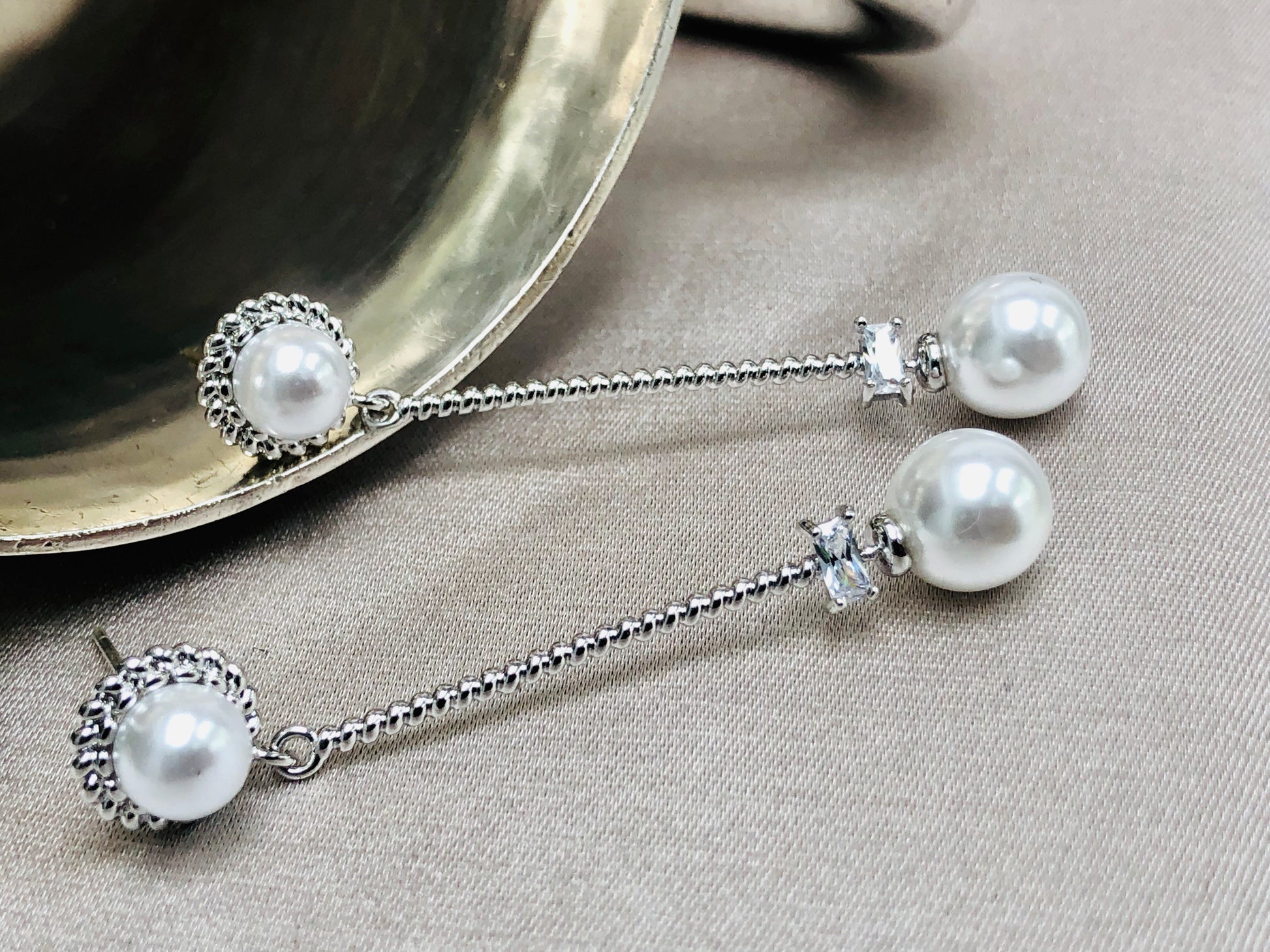 A pearl and small glass diamond hang from a spiraled metal rod. The earring's stud is another simple pearl surrounded by a wreath of silver metal.