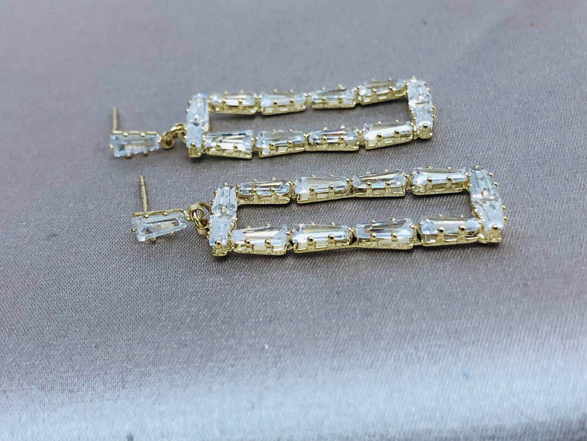 Small diamonds connect in a delicate rectangular frame that dangles lightly from the ear.