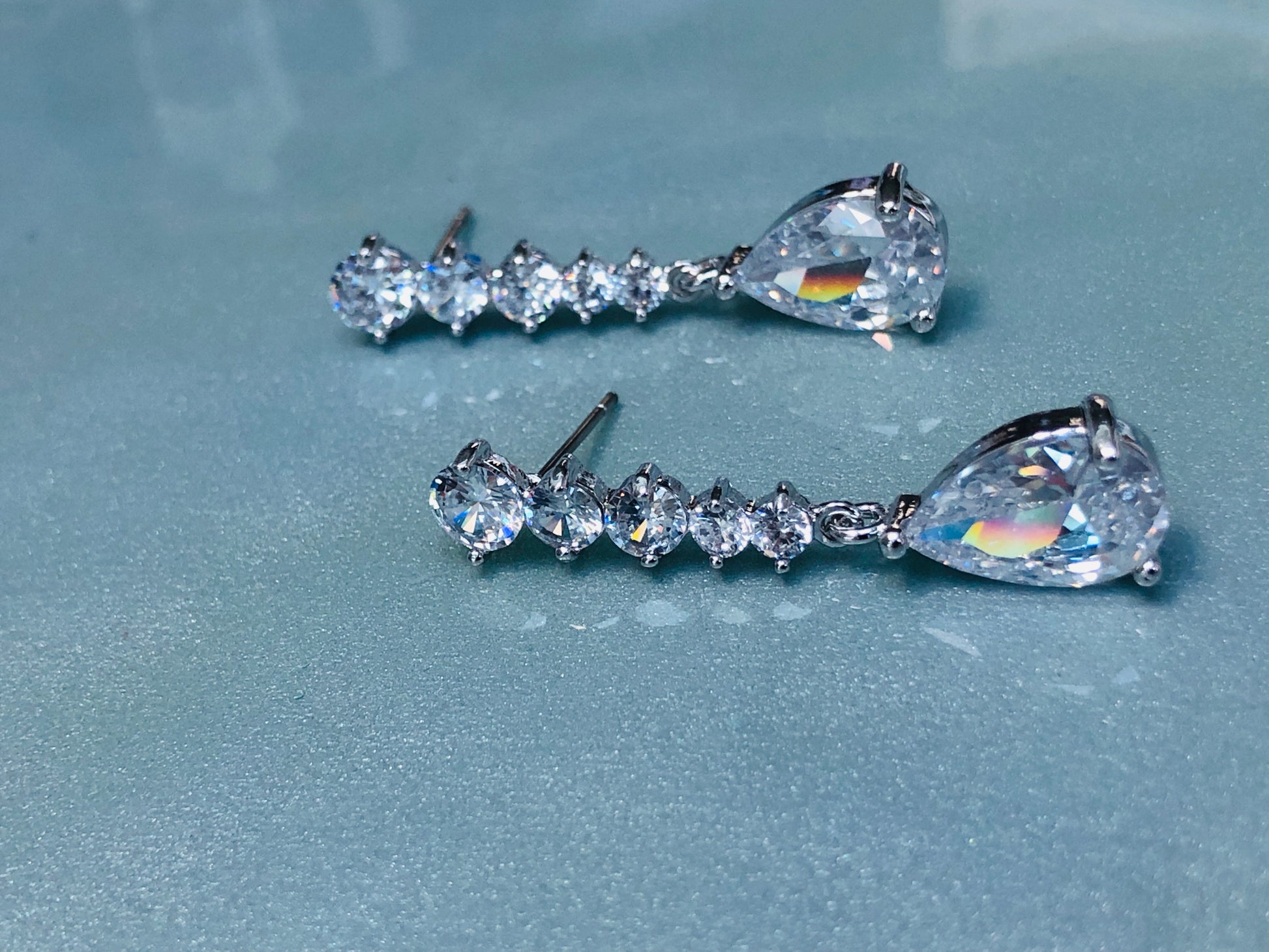 A glass teardrop dangles from a descending string of smaller glass diamonds.