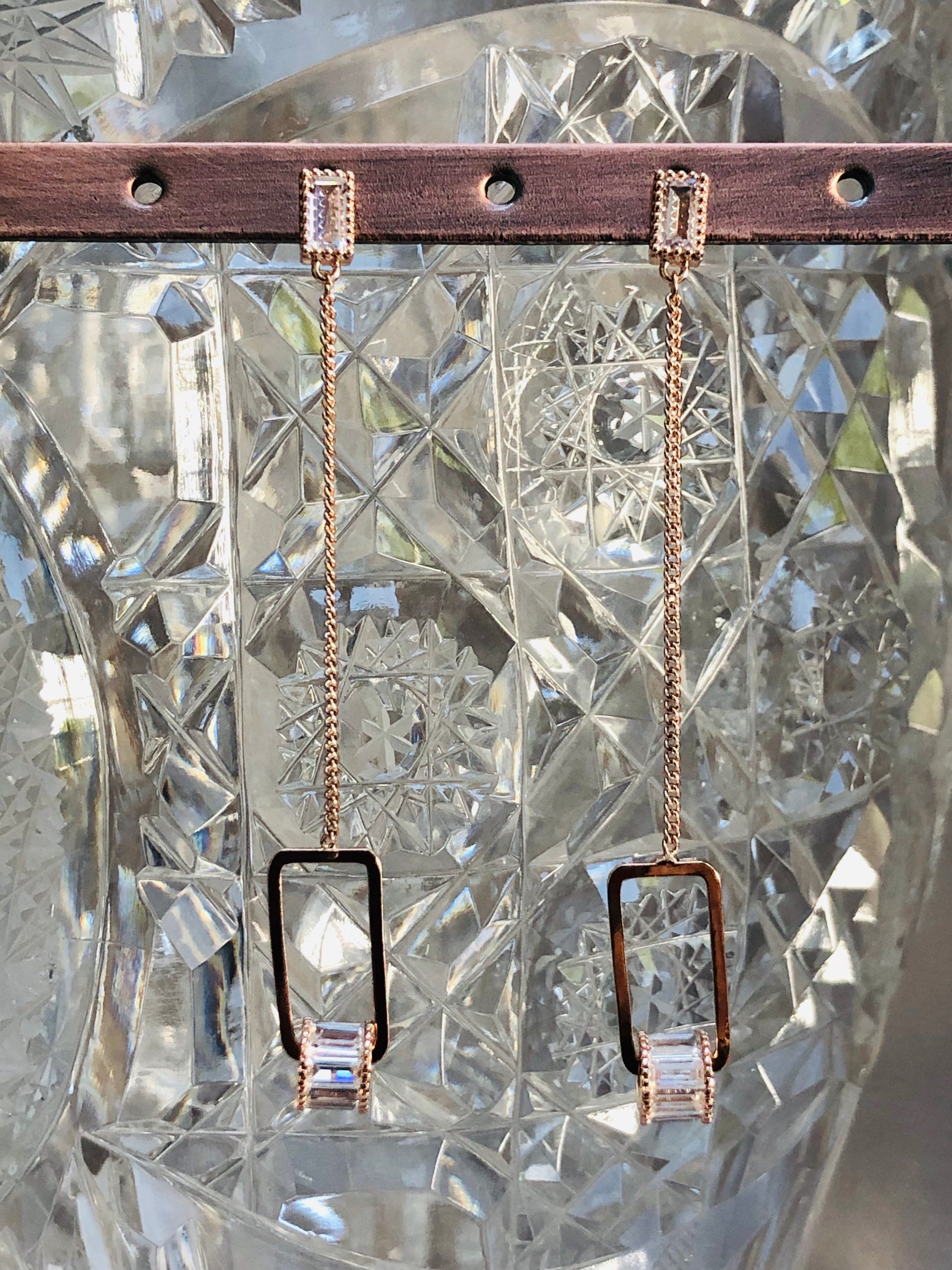 Small golden frames dangle from a long chain. Each delicate frame has a glass adornment encircling its end.