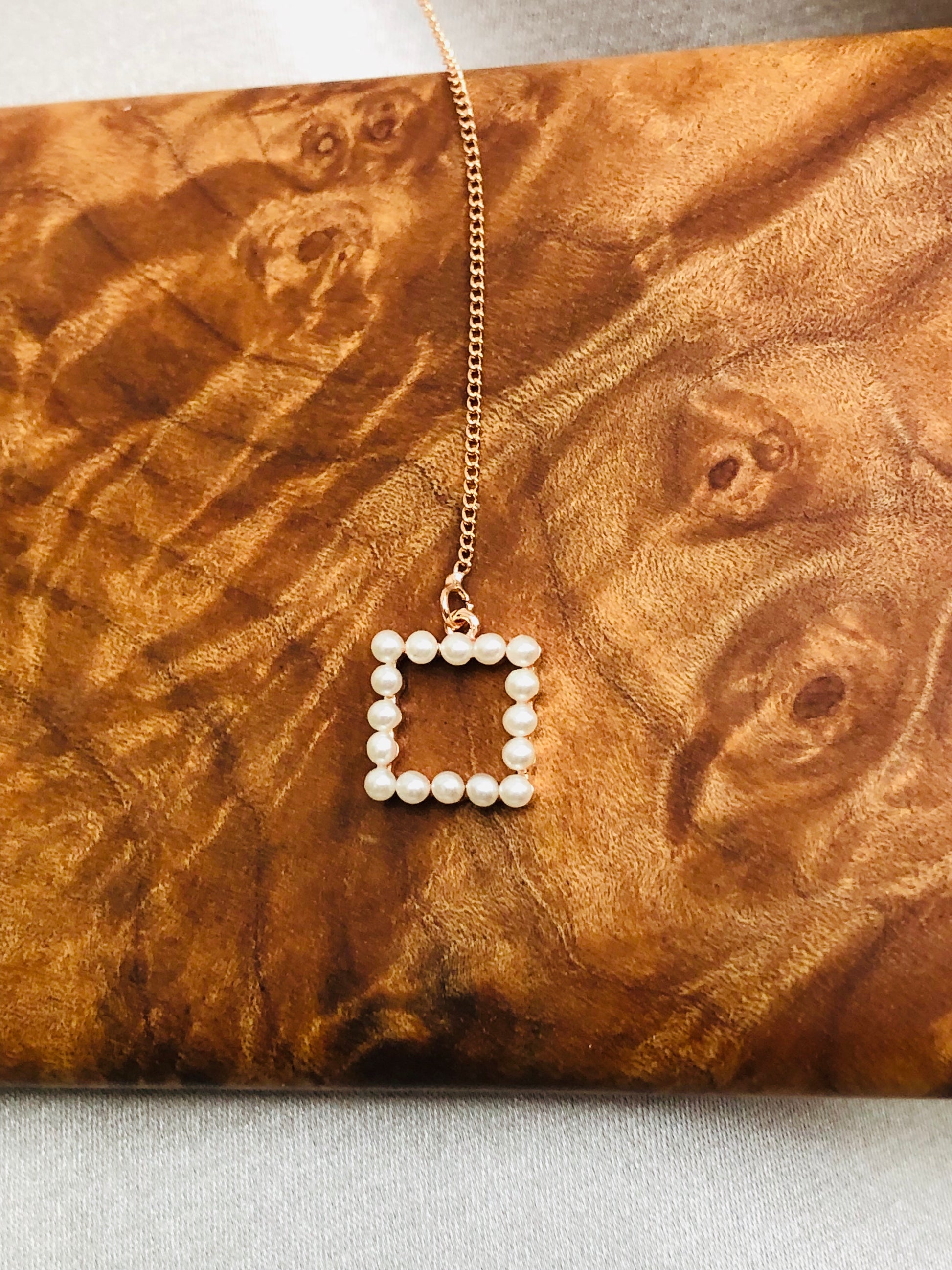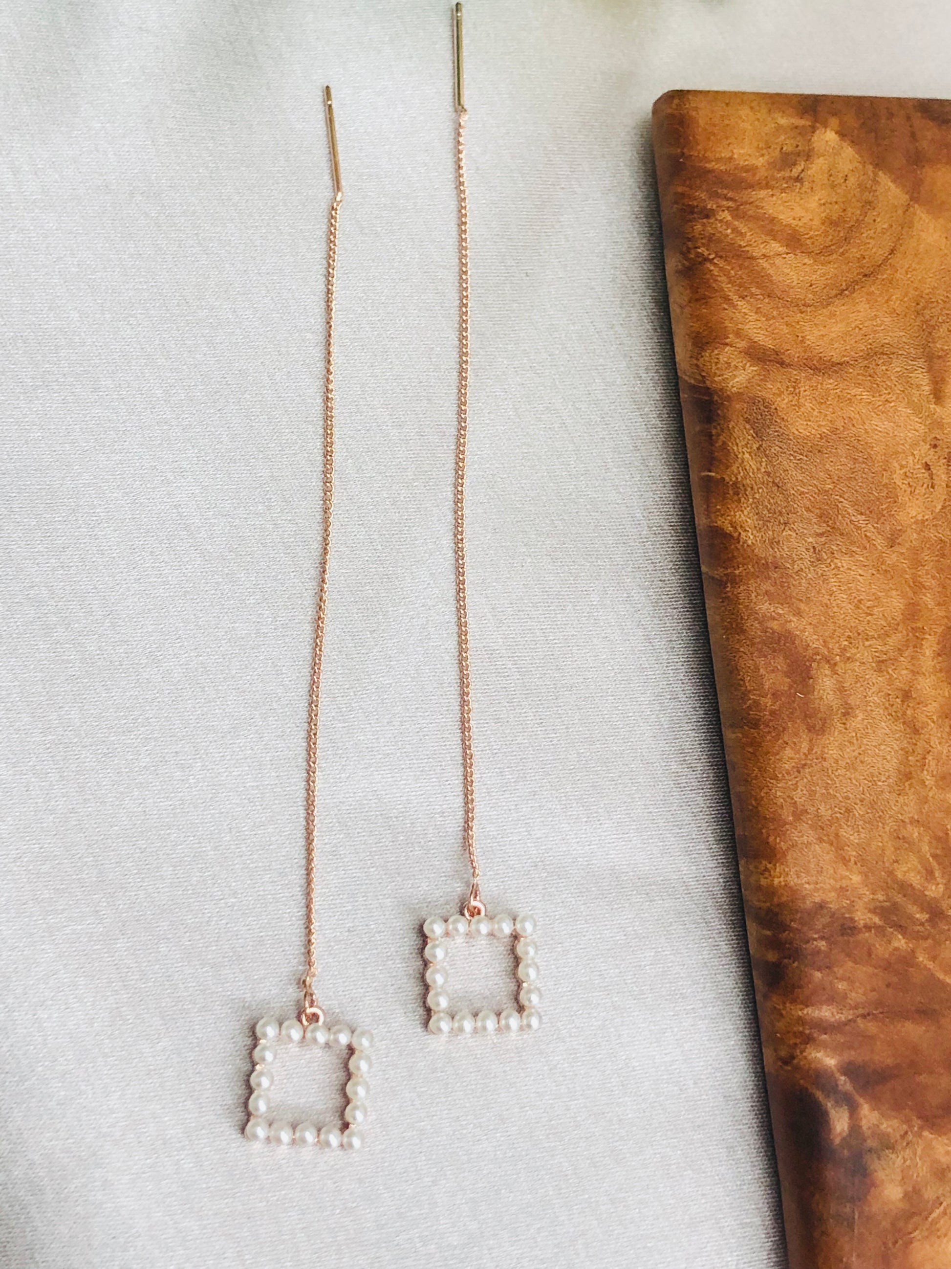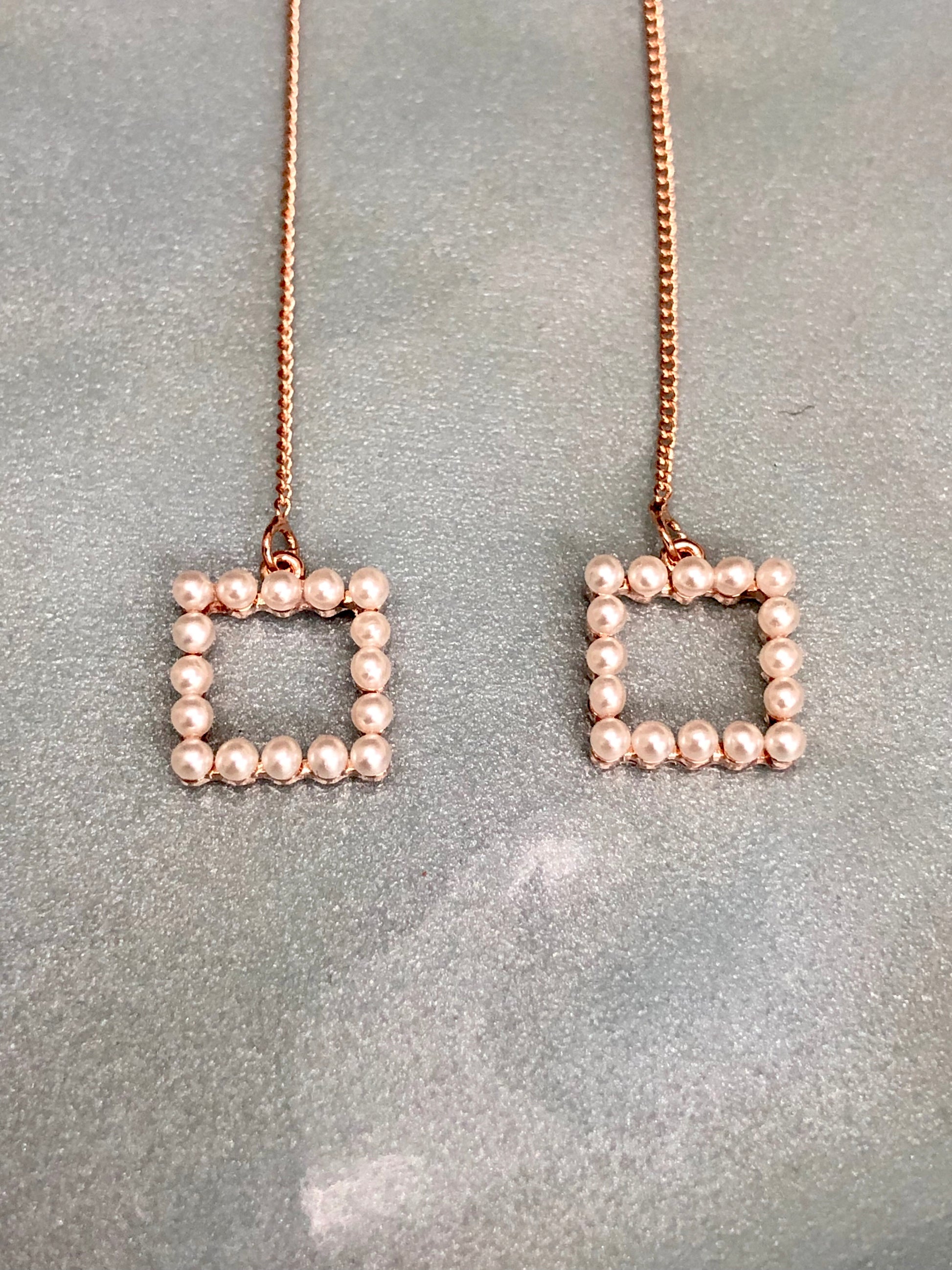 Two small squares made of mini pearls hang from long golden chains.