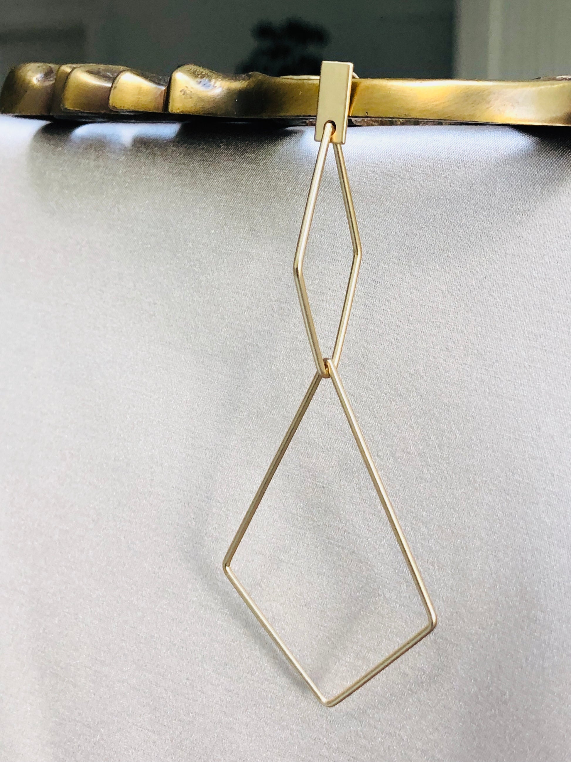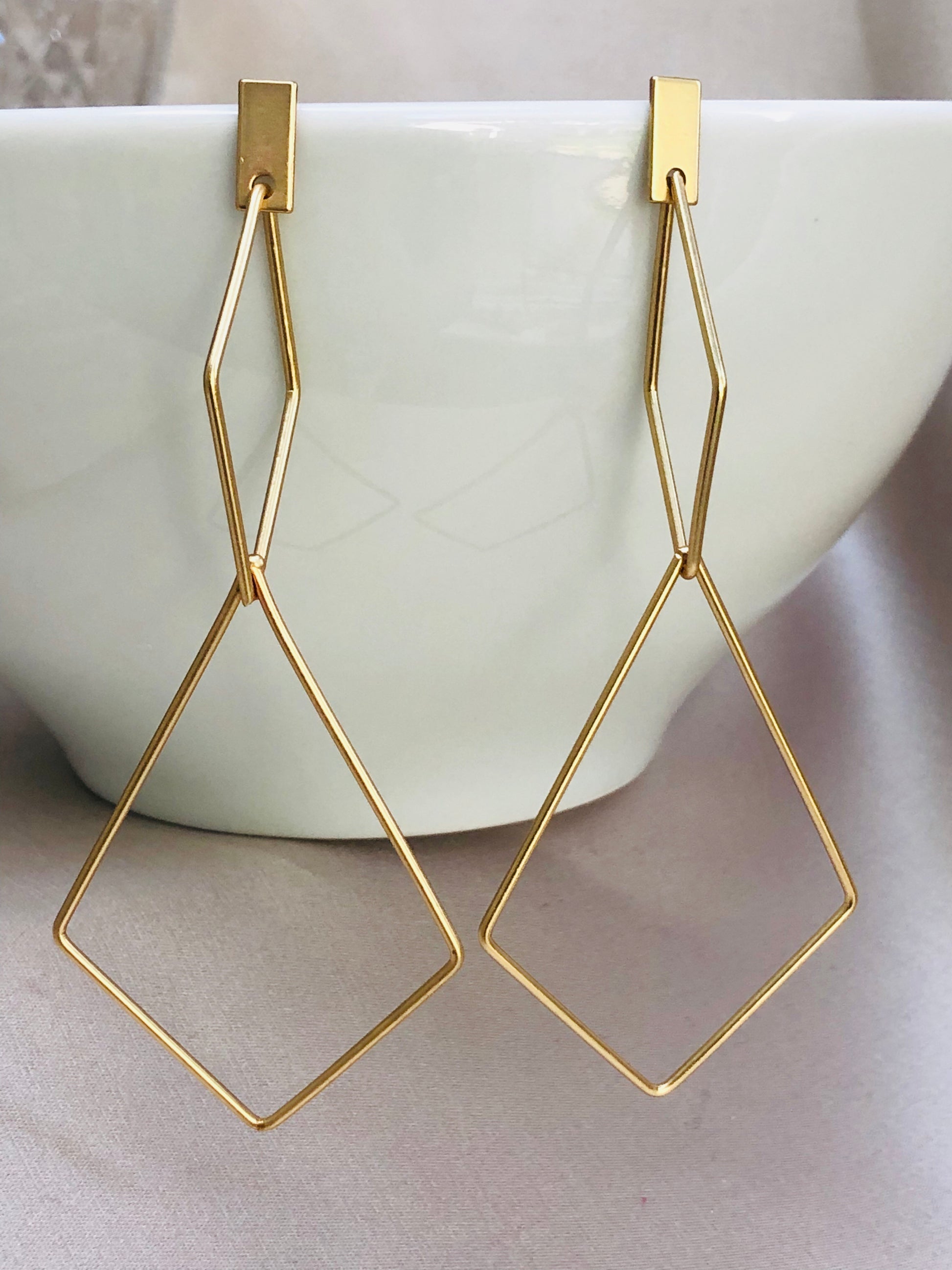 These large geometric earrings are made from matte golden metal. These earrings are simple but make a statement with their interlacing design and brilliant color!
