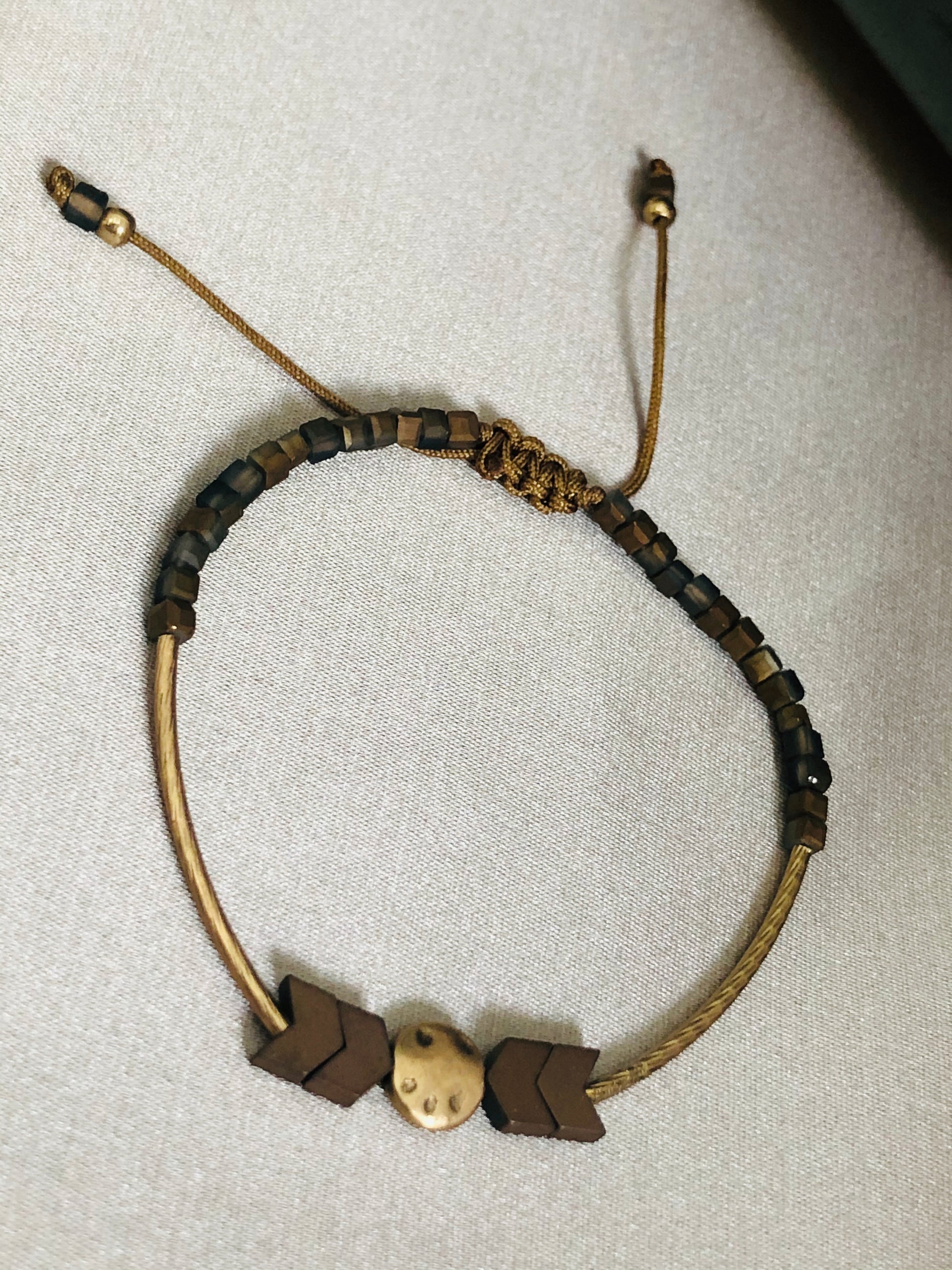 This adjustabletension bracelet is decorated with small dark stones and brown arrows pointing towards a golden accent.