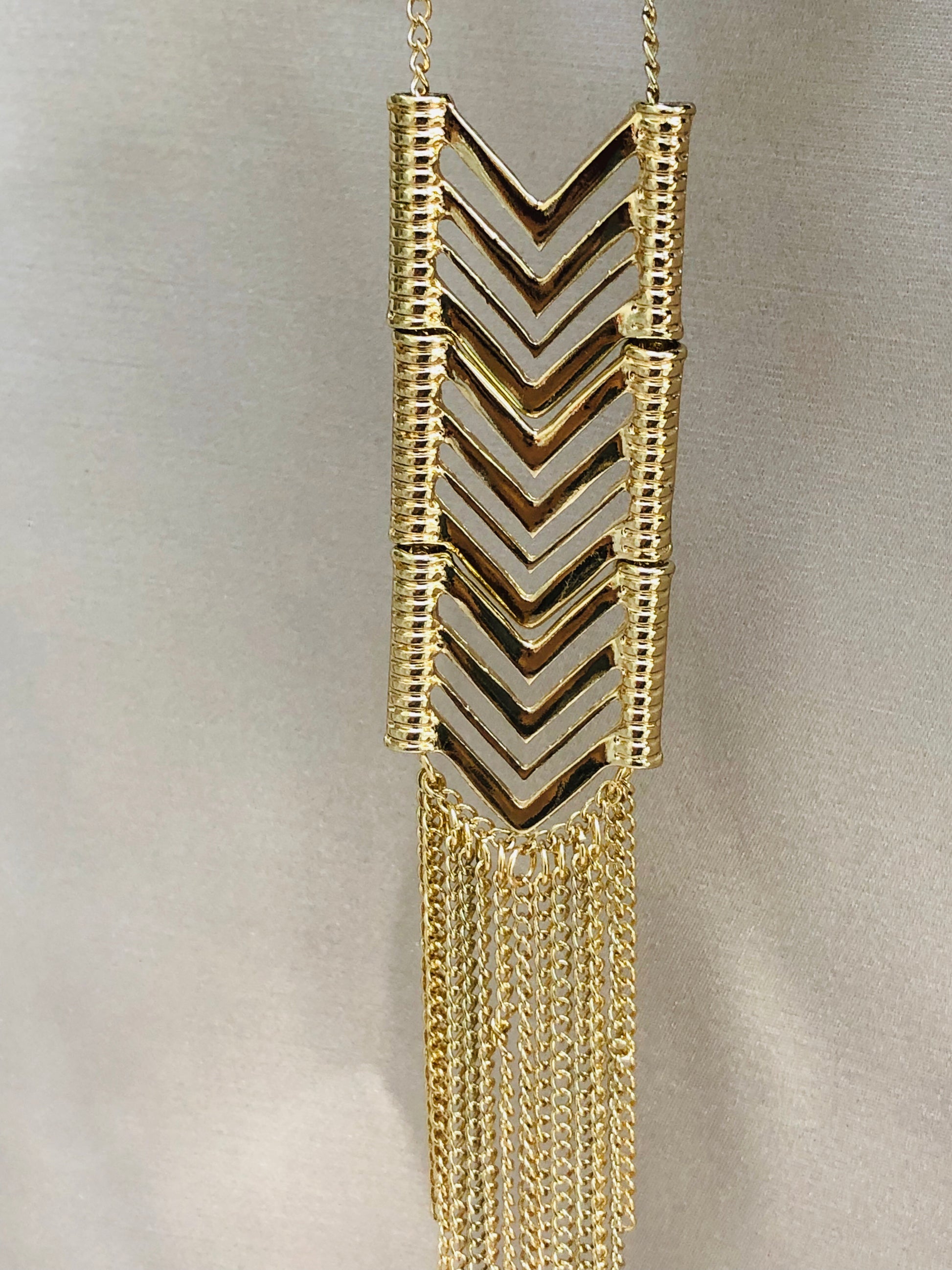 This necklace is long and falls to about the sternum. Golden chains rain from descending silver arrows.