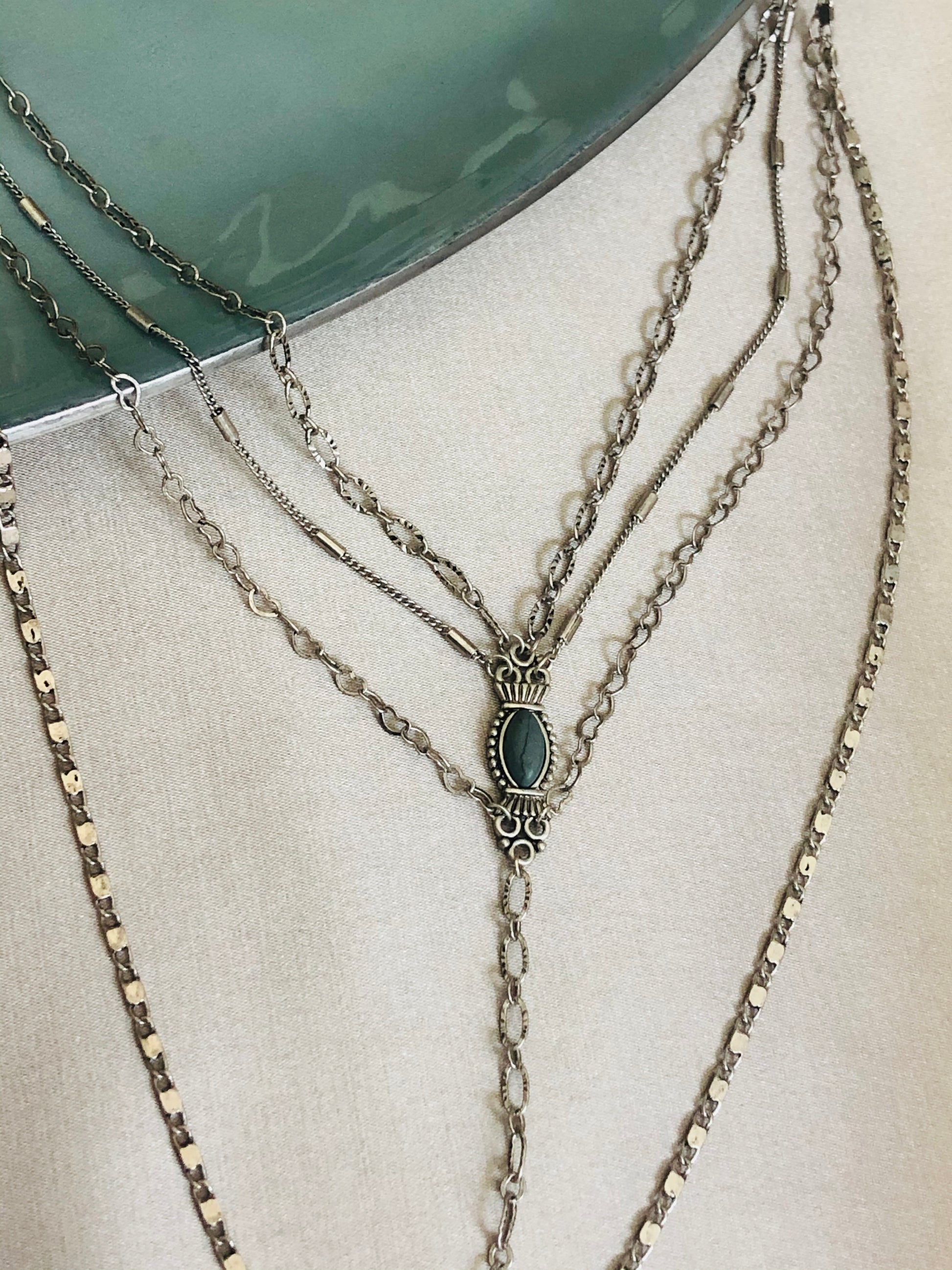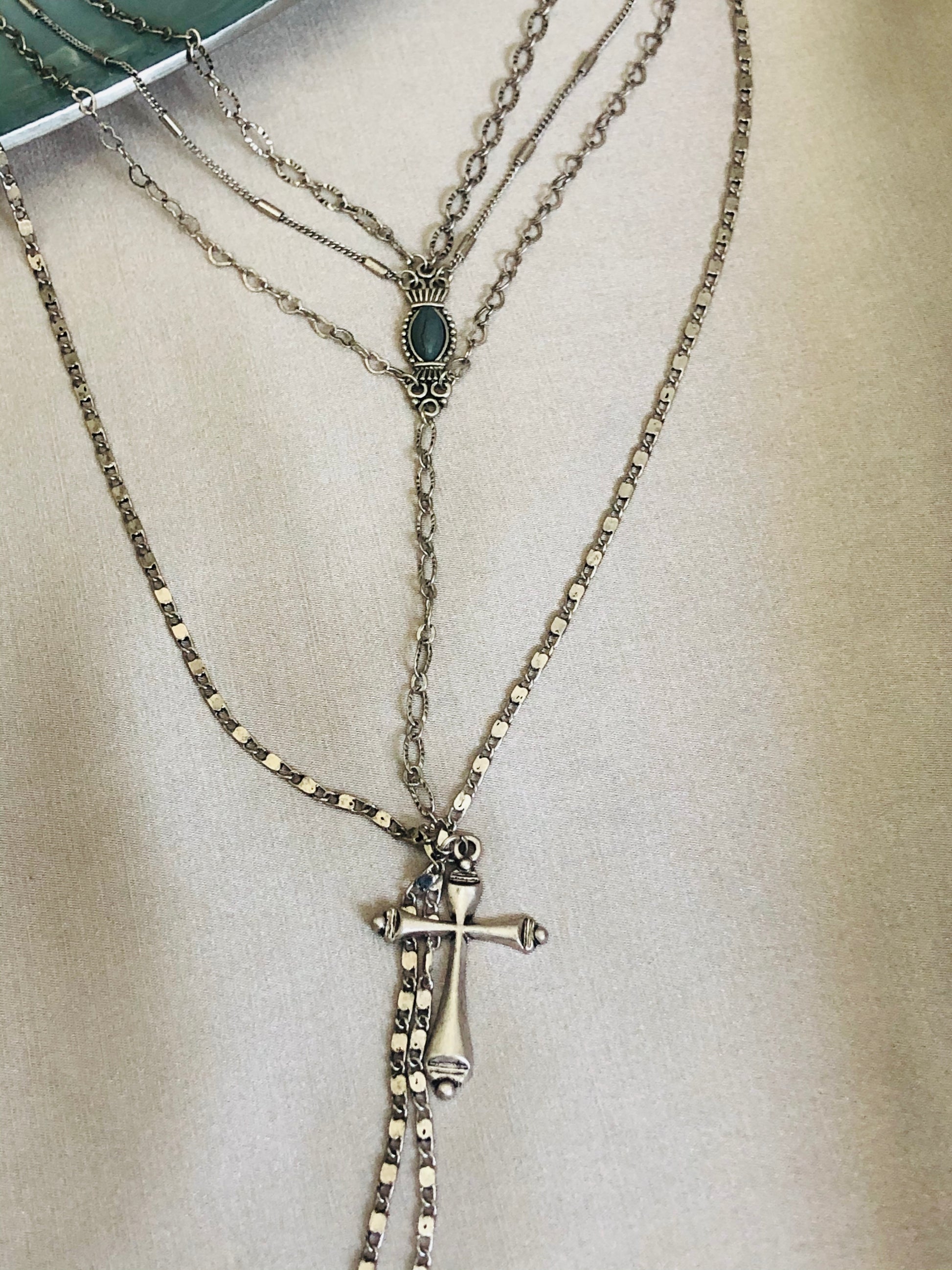 Multi layers of matte golden chains meet around a simple stone center. A metal cross dangles from the united chains.
