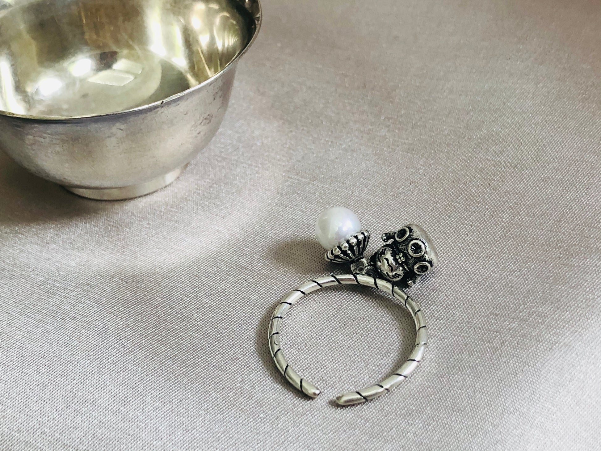 So cute, this silver ring is decorated with a pearl and tiny silver cat charm! Adjust size by gently squeezing or stretching the band.